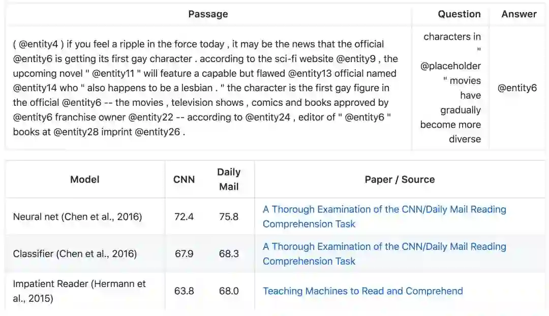 SciTail(《SCITAIL: A Textual Entailment Dataset from Science Question Answering》)导出数据集包含 27k 个条目。和 SNLI、MultiNLI 不同,它不是众包数据集,但是从已有的句子中创建的,假设是从科学问题和对应答案候选中创建的,同时相关网站的来自大型语料库的句子被用作前提。模型基于准确率评估。
