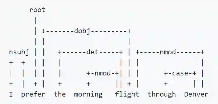 词之间的关系在句子之上用定向、标记的弧线(从标头词到依存)展示,+表示依存。