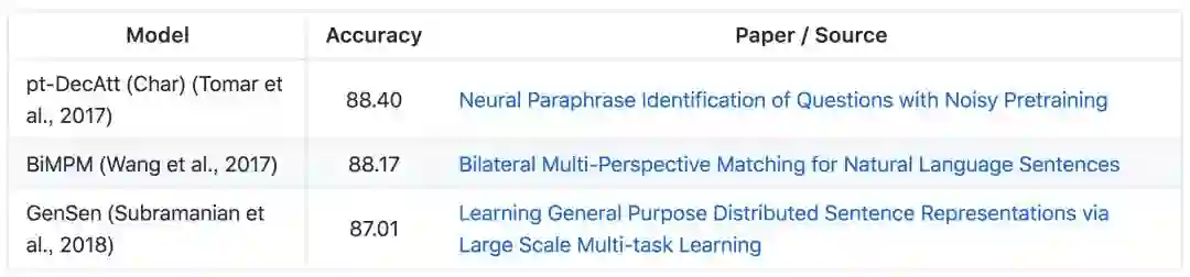 Quora Question Pairs 数据集由 400000 对 Quora 问答组成,系统需要识别一个问题是不是其它问题的副本。模型也是通过准确率度量。