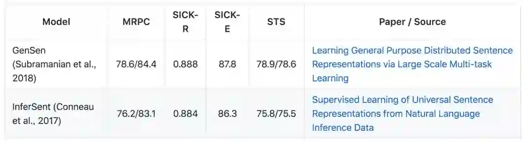 SICK 相关性(SICK-R)任务训练一个线性模型以输出 1 到 5 的分数,并指代两句子之间的相关性。相同数据集(SICK-E)能视为使用蕴含标签的二元分类问题。SICK-R 的度量标准也是皮尔森相关性,SICK-E 可以通过文本分类准确度度量。