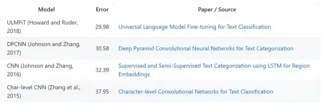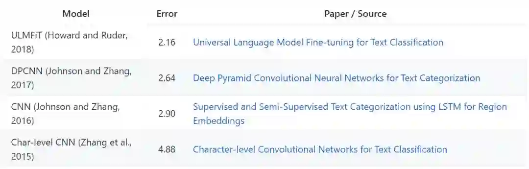 AG News 语料库包含来自「AG's corpus of news articles」的新文章,在 4 个最大的类别上预训练。该数据集包含每个类别的 30000 个训练样本,以及每个类别的 1900 个测试样本。模型基于误差率评估。