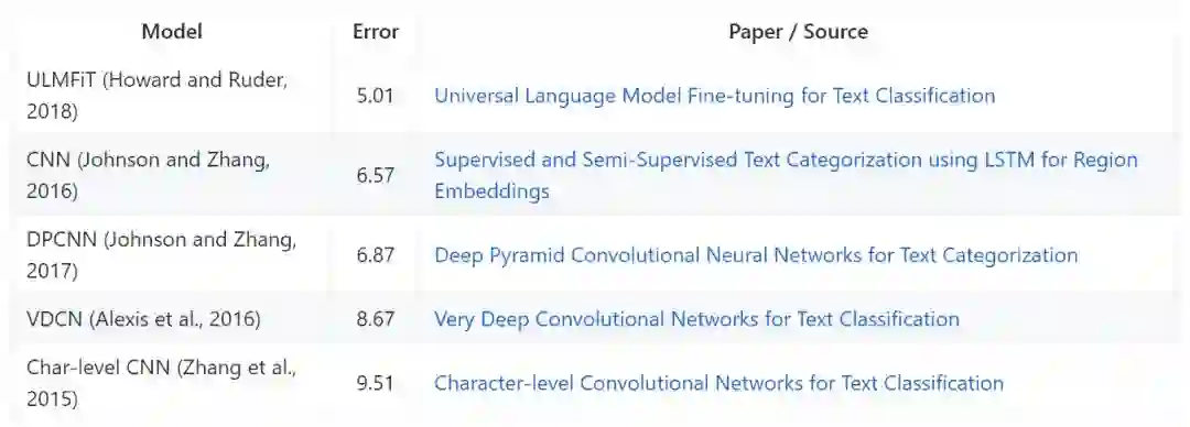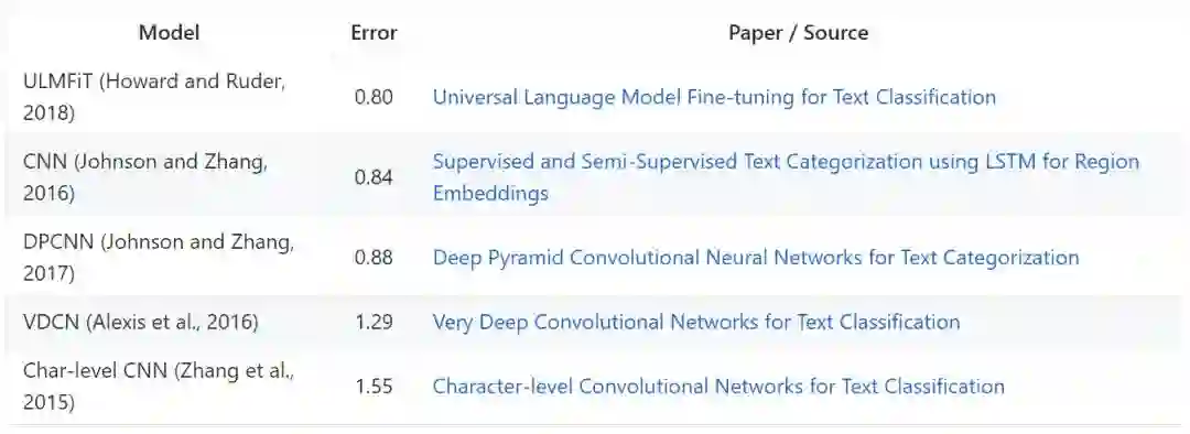 Yelp 评论数据集包含超过 500000 条 Yelp 评论。它们同时有二元和细粒度(5 个类别)级别的数据集,模型通过误差率(1 - 准确率,越低越好)评估。