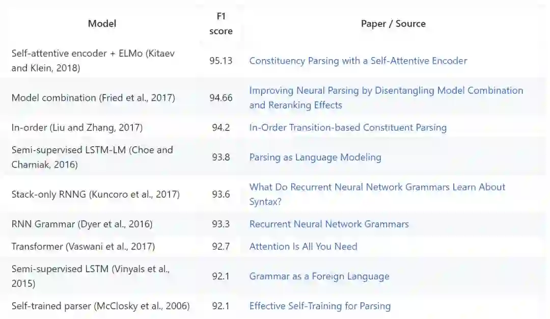 Penn Treebank 的「Wall Street Journal」部分用于评估选区解析器。第 22 部分用于开发,第 23 部分用于评估。模型基于 F1 评估。以下大多数模型整合了外部数据或特征。要对比仅在 WSJ 上训练的单个模型,参见《Constituency Parsing with a Self-Attentive Encoder》。