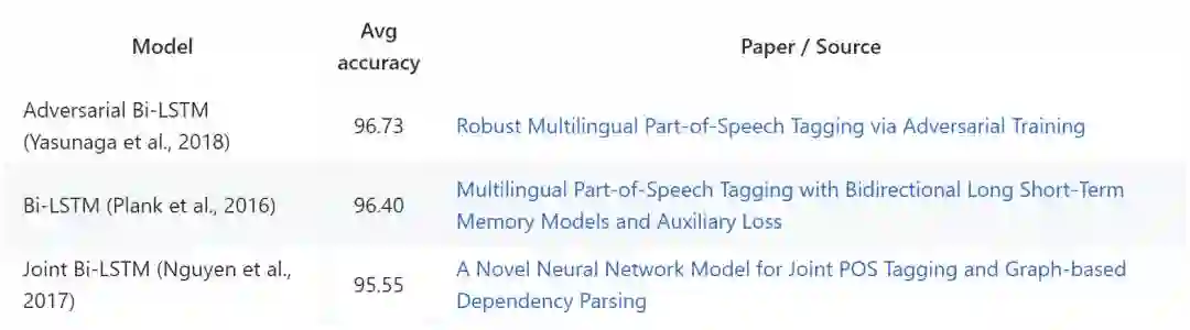 Universal Dependencies(UD)是一个跨语言语法标注的框架,它包含超过 60 多种语言的 100 多个 treebanks。模型一般通过 28 种语言中的平均测试准确率进行评估。