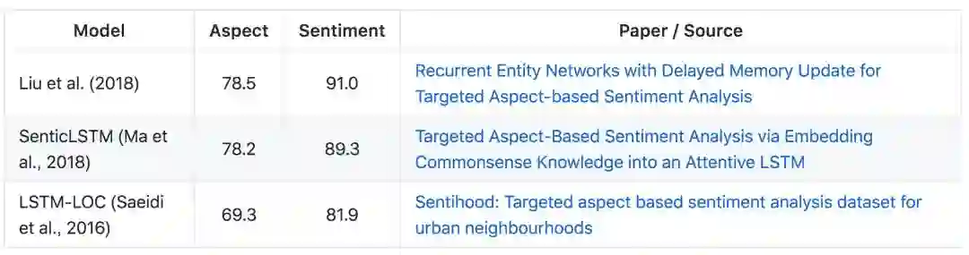 Sentihood 是一个用于针对基于方面的情感分析(TANSA)数据集,它旨在根据具体的方面识别细粒度的情感。数据集包含 5215 个句子,其中 3862 个包含单个目标,其它有多个目标。该任务使用 F1 分数评估检测的方面,而使用准确率评估情感分析。