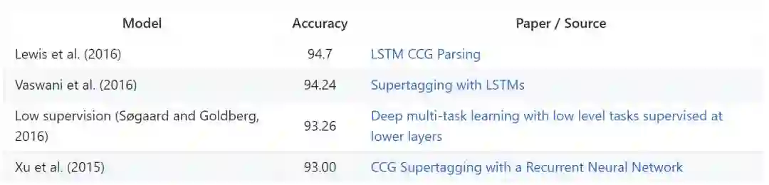 CCGBank 是 CCG 衍生物的语料库,以及从 Hockenmaier 和 Steedman 2007 年提出的 Penn Treebank 中提取的依存结构。第 2-21 部分用于训练,第 00 部分用于开发,第 23 部分用作域内测试集。其性能仅在 425 个最常用的标签上计算。模型基于准确率来评估。