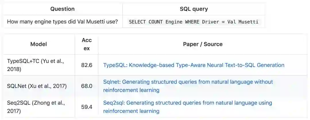 WikiSQL 数据集包含 87673 个问题样本、SQL 查询语句和由 26521 张表中建立的数据库表。该数据集提供了训练、开发和测试集,因此每一张表只分割一次。模型基于执行结果匹配的准确率进行度量。