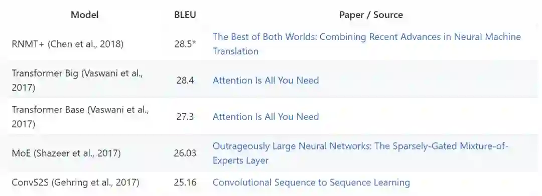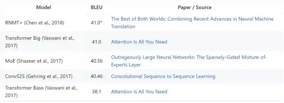 机器翻译是将句子从源语言转换为不同的目标语言的任务。带*的结果表示基于 21 个连续评估的平均验证集 BLEU 分数的平均测试分数,正如 Chen 等人的论文《The Best of Both Worlds: Combining Recent Advances in Neural Machine Translation》所报告的。