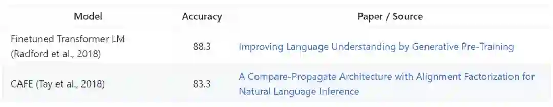 斯坦福自然语言推理(SNLI)语料库包含大约 550k 个假设/前提对。模型基于准确率评估。