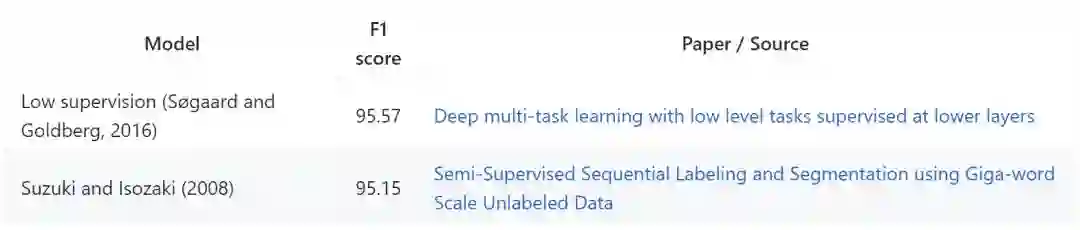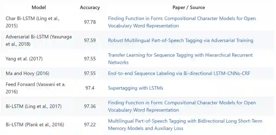 用于词性标注的标准数据集是华尔街日报(WSJ)分配的 Penn Treebank,它包含 45 个不同的词性标签。其中 0-18 用于训练、19-21 用于验证其它 22-24 用于测试。模型一般都通过准确率进行评估。