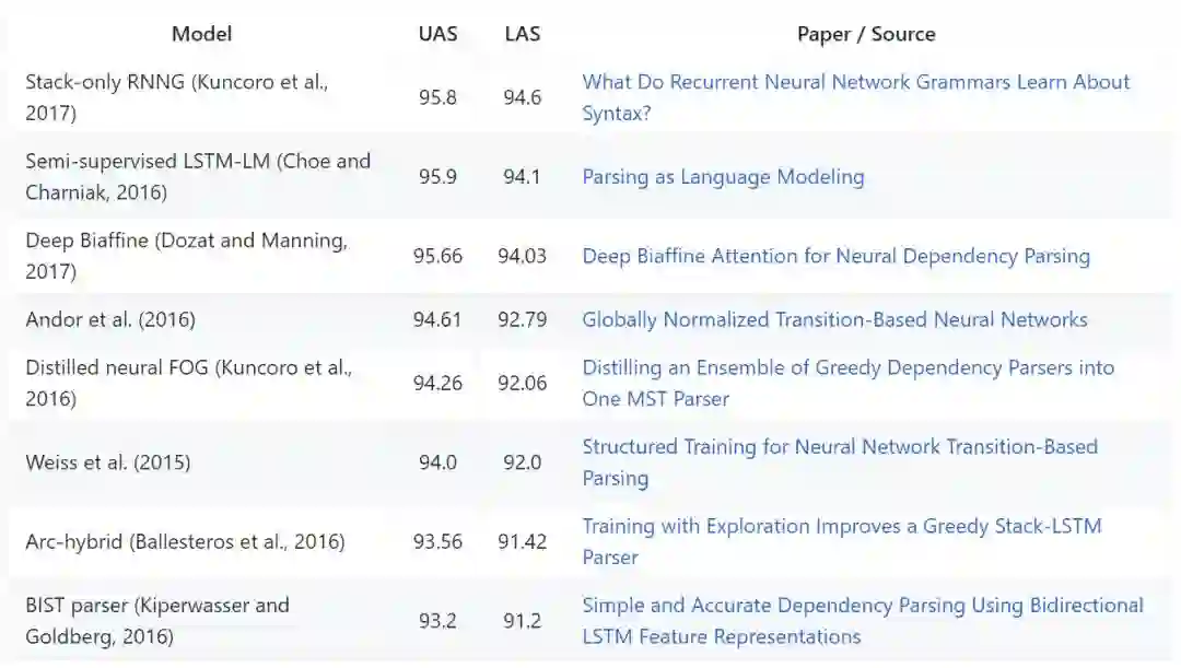 模型在《Stanford typed dependencies manual》中提出的 Penn Treebank 的 Stanford Dependency 变换和预测词类标记上进行评估。评估指标是未标记依附分数(unlabeled attachment score,UAS)和标记依附分数(LAS)。