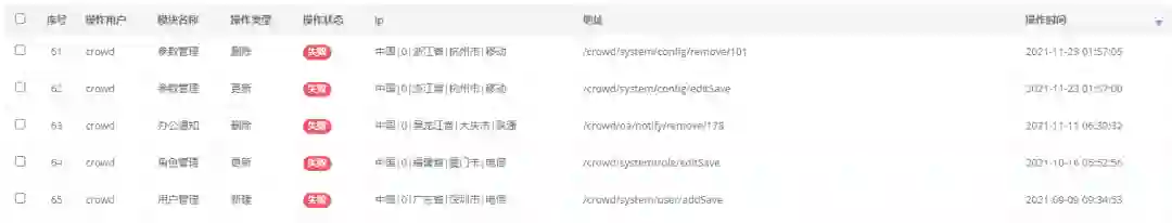 操作页面:记录执行操作时调用的接口,如/crowd/system/user/list,当出现异常时,便于技术人员快速定位问题
