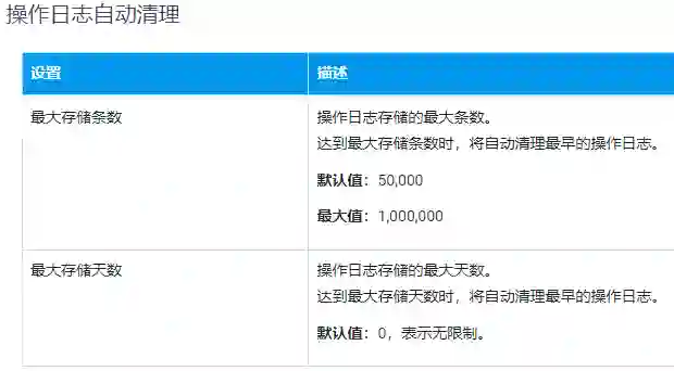 用户操作日志更新频繁,长时间会积累大量数据,占据存储空间,并且操作日志具有时效性,过早的日志没有查询价值,因此可通过存储天数或存储条数的限制自动清理无用日志。