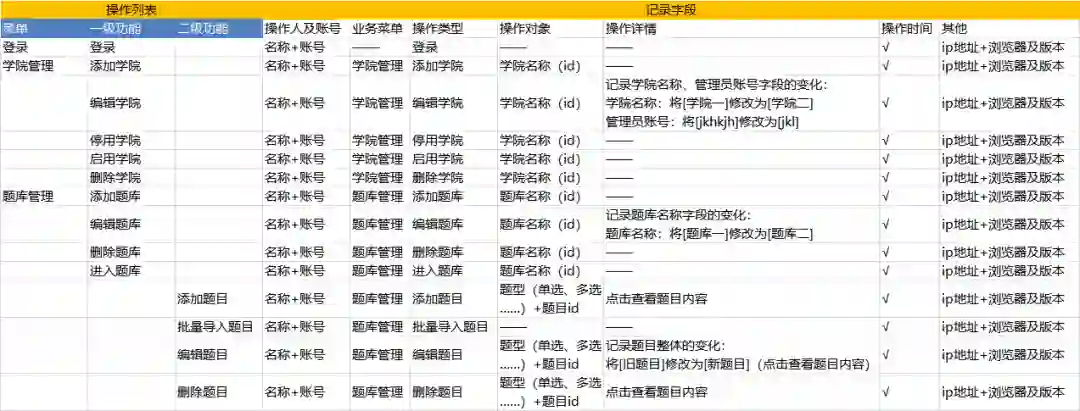 如上图所示,左边是产品的功能列表,经过产品经理的调研和分析,认为本项目的用户操作日志中不需要记录查看及查询操作,并且也不需要记录公告管理中的所有操作,因此制作了右边的操作列表。