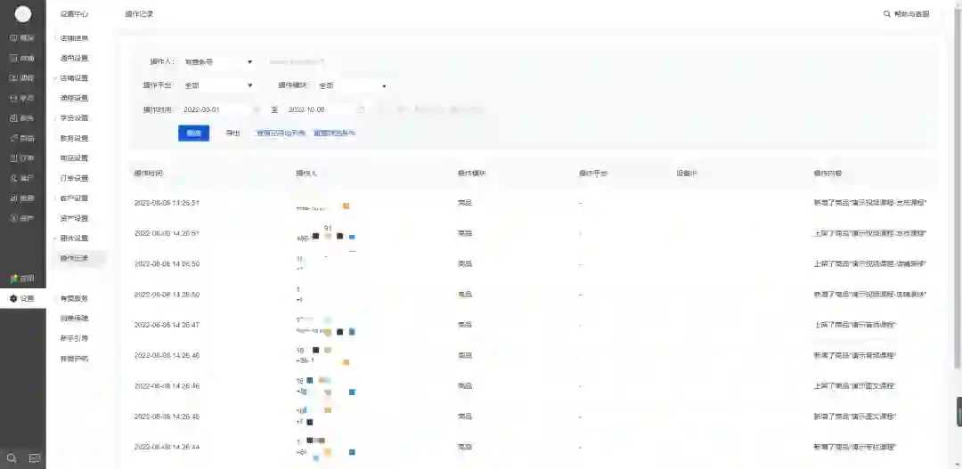 为了便于用户查找,应针对操作字段提供查询和筛选功能,如按用户信息进行模糊搜索、按操作时间段进行查询、按业务菜单和操作类型(筛选时要合并类型,如“新增学生”和“新增老师”,都属于“新增”类型)进行筛选等。