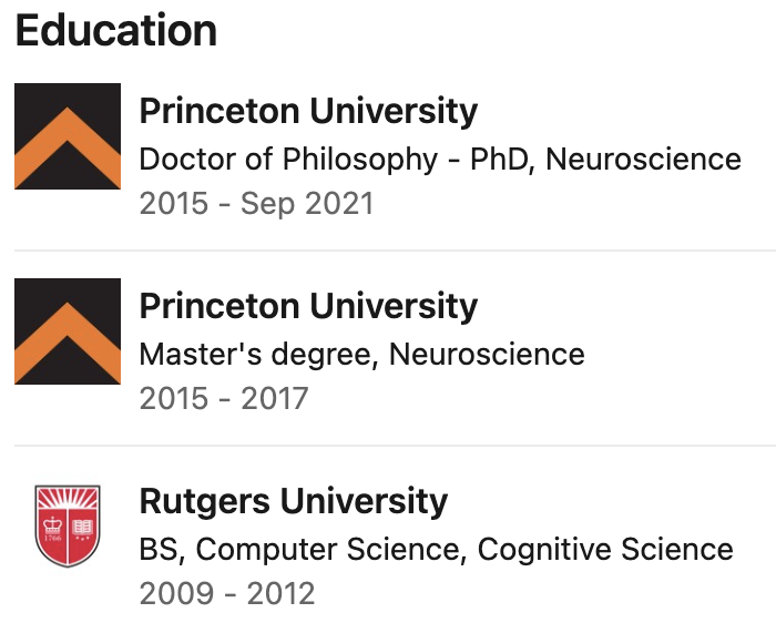 他于2012年获得罗格斯大学计算机科学学士学位,随后又去普林斯顿大学攻读,并分别于2017年和2021年获得神经科学的硕士和博士学位。