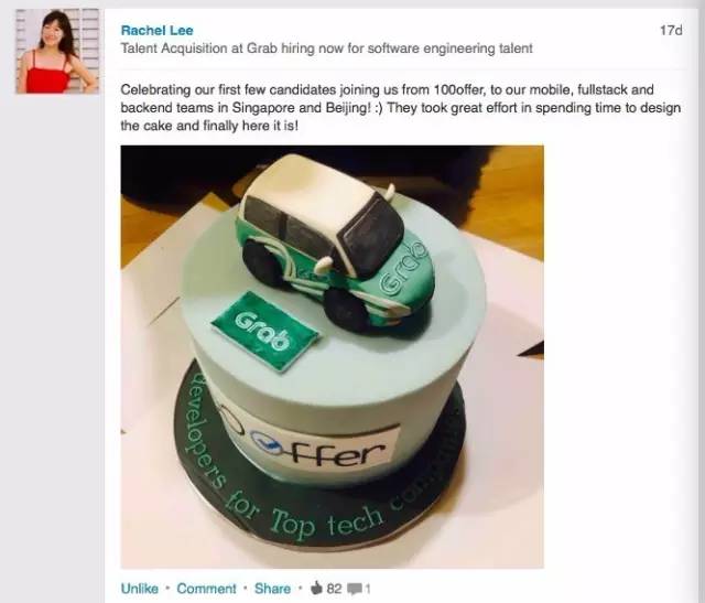 △ Grab HR 在Linkedin上晒出的100offer x Grab蛋糕,庆祝签约100offer某用户