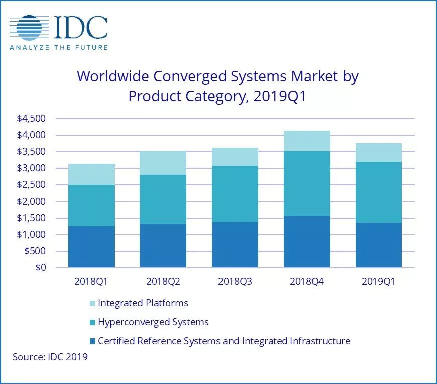 IDC周二发布了最新的《全球融合系统季度报告》(Worldwide Quarterly Converged Systems Tracker),报告显示,2019年第一季度这个市场的收入同比猛增19.3%,达到37.5亿美元。戴尔科技公司再度以最大的市场份额遥遥领先。