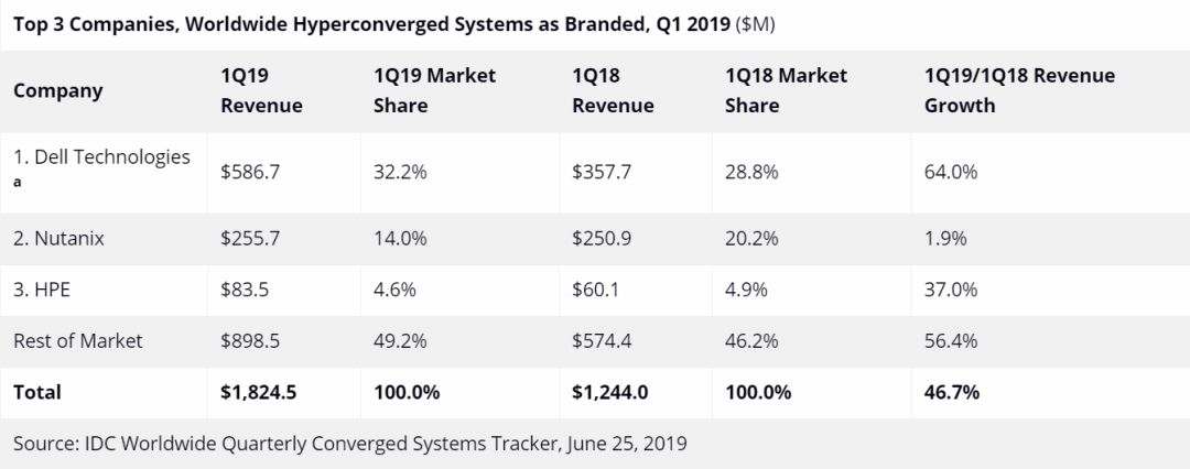 戴尔在超融合系统硬件领域表现尤为出色,其市场份额从2018年第四季度的28.6%增长到现在的32.2%。Nutanix和惠普企业(HPE)分别排在第二位和第三位: