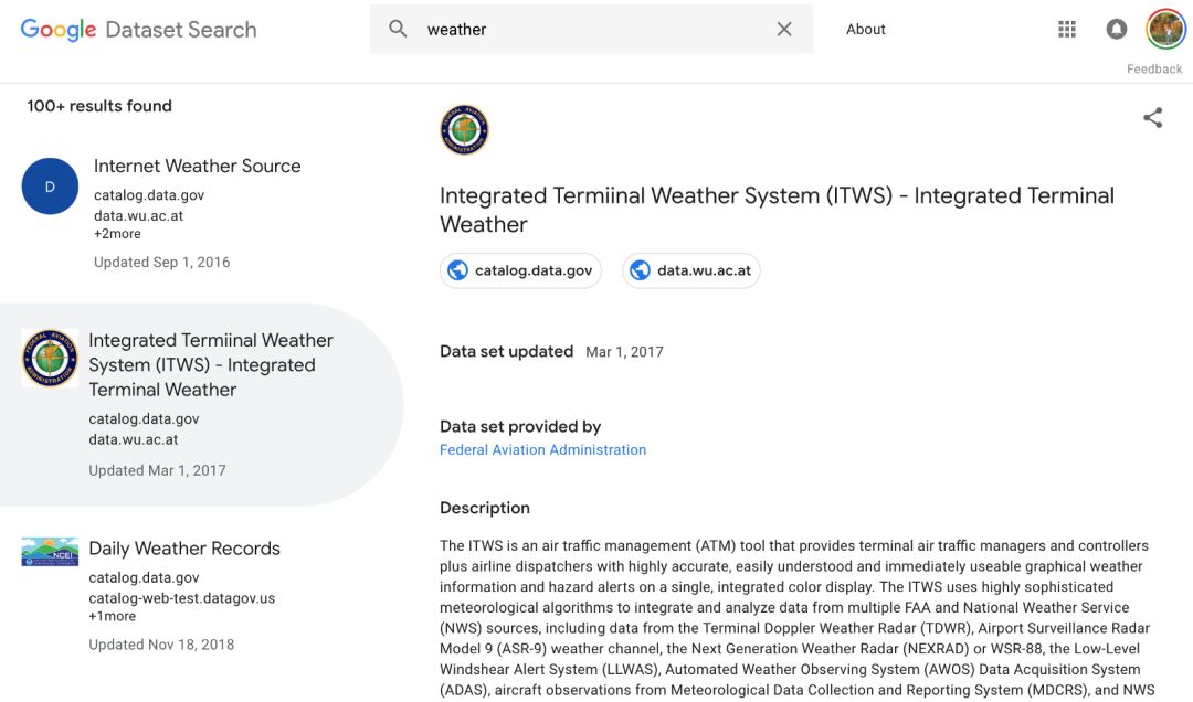 该数据源包含多个不同领域的数据集,如:公共交通、生态资源、卫星图像等。它也有一个搜索框来帮助你找到你正在寻找的数据集,另外它还有数据集描述和使用示例,这是非常简单、实用的!