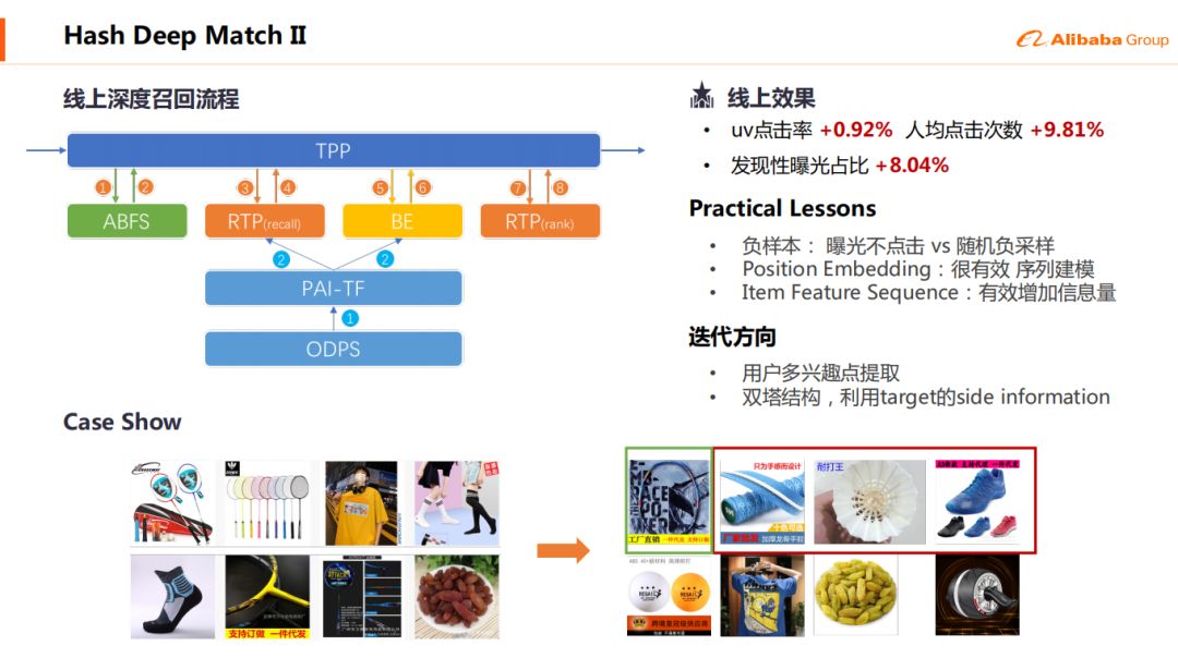 18年深度学习在业界越来越火了,所以我们顺着这个潮流,在排序当中是走到了DIN和DIEN,这两个工作是阿里妈妈北京的团队做的在广告上的一个CTR的模型的排序,以及顺着Youtube的Deep Match的工作我们也做了我们这边的Deep Match,以及一些机制的构建,补足了之前我们只有CTR模型没有CVR模型的一个短板,一些更“标题党”的商品会往下落。
