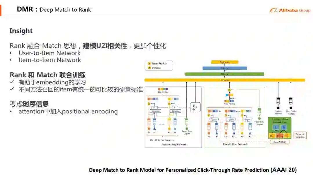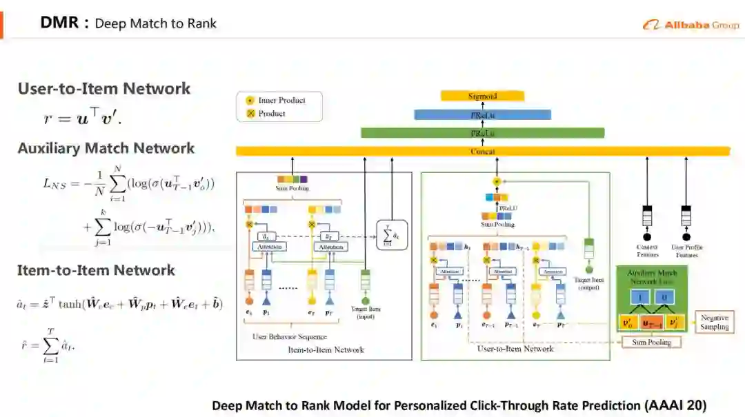 DMR是我们最新发表在AAAI2020上的论文 ( oral ),在Ranking中融合了Matching的思想,建模u2i相关性。DIN和DIEN都是聚焦用户兴趣的建模,而DMR又往前走了一步,对u2i相关性进行建模,这个相关性可以直接衡量用户对商品的偏好程度,从而提升模型的效果。这个u2i相关性是无法通过统计的方法得到的,因为通常不会给用户推荐重复的商品;也无法从召回得到,因为通过是有多路召回,每路召回的相关性不能相互比较。