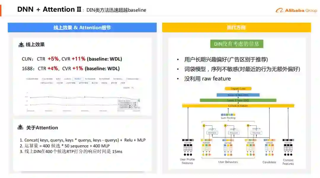 17年的时候,我们演进到了WDL的过程,然后18年的时候因为阿里妈妈在KDD18的时候发表了DIN的那篇paper,同时也在公司内部做了一些介绍,我们就顺着这个潮流从WDL走到了纯的用户向量表征再接MLP的范式。