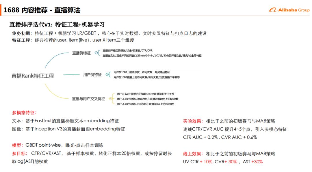 业务初期选择了特征⼯程 + 机器学习 LR/GBDT,核心在于实时数据、实时交叉特征打点⽇志的建设,在特征⼯程上选取了经典推荐的user, item(live), user X item三个维度,这里相比于之前排权重,UV和转换率都有一个比较明显的提升。