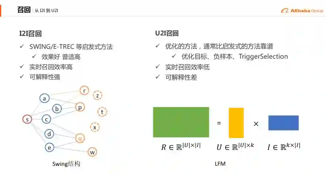 从17年开始,我们才更加的专注于个性化的分发,不管是搜索还是推荐。如果是做推荐的同学们也知道,一开始,我们要做召回、排序、业务的定制以及类似的一些工作。所以我们在17年的时候,主要是借助阿里之前淘系的基建,比如SWING & E-TREC这些I2I的方法,这其实就是协同过滤的升级版本,然后去进行一个基本的召回方式,以及用LR到GBDT去做一个最初始的CTR预估。然后到年底的时候,我们从LR到GBDT转换到了W&DL,因为当时,大概是16年吧,谷歌的W&DL的论文出来后,然后17年在阿里有一个比较大的场景的一些实践。可能有些针对业务定制的是我们的Unbalance I2I,这个I2I的意思呢,是我们总有一些业务是一个小的商品池,它是一个比较特定的它不是一个全域可推荐的范围,当我们进行一个大的商品触发的时候,就是定向的往这个小的商品池里触发。