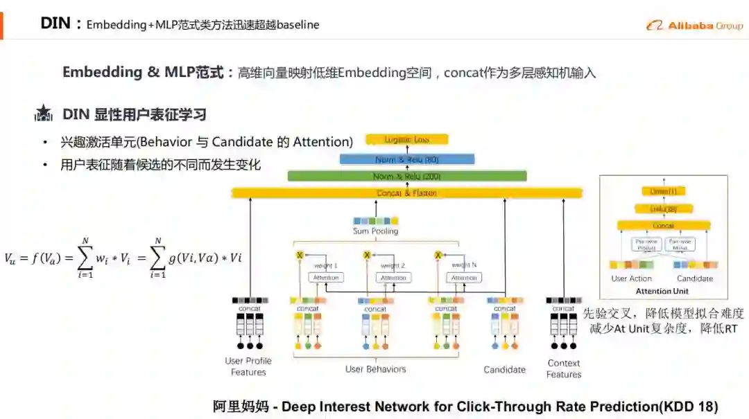 DIN是显性的用户表征学习,对Behavior和Candidate引入了Attention使得用户表征随着候选的不同而发生变化。DIN结构如上图所示。