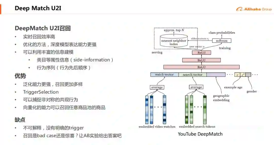 16年YouTube提出的Deep Match的方法主要是解决了之前召回效率低的问题,因为这种方法是把用户的历史序列以及他对应的user profile进行一个embedding之后,然后通过MLP得到一个用户的表征,这个表征由于是实时生成,用户的足迹在不断的往里面加,那么这个效率是比较高的。Deep Match模型可以更多的用到一些商品侧的自身的一些行为、类目、属性的信息,从而能更好的构建模型。但是它的可解释性较差,另外召回是bad case还是惊喜是一个各花入各眼的过程,需要线上的ABtest给出答案。