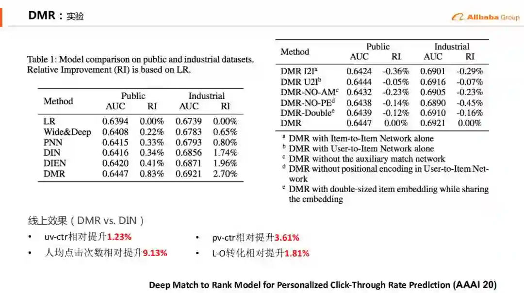 在最近的一年,我们在召回上去进行了一个多兴趣点的Deep Match的尝试,在粗排上从GBDT走到了双塔,以及在排序当中,之前是借鉴公司以及业界的一些先进的经验,我们在这边有了一些自己的更多的一些创新的工作,比如说在CTR中有一些DMR,等一下会详细的讲到(AAAI 2020),还有就是在CVR模型当中走到了ESMM+MMOE这样子的模型。最近特别火的就是直播了,以及直播这种内容化的一些推荐。