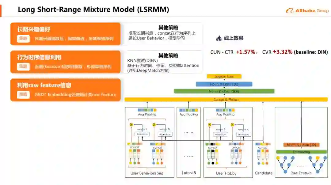 基于DIN存在的一些问题,,我们做了一些改进,提出了LSRMM ( Long Short-Range Mixture Model ),该模型能够去抽取一个长期的用户偏好。这个兴趣偏好不是整个end to end学出来的,而是直接通过离线的方式统计出用户在各个时间是否都对于一个特定的类别的东西有一个偏好。比如说像我喜欢羽毛球,那在候选中会额外的出现羽毛球。
