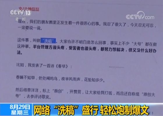 央视新闻客户端8月29日消息,最近,一种新的抄袭手法“洗稿”在互联网上开始兴起,有人甚至说自媒体“洗稿时代”来临。所谓“洗稿”就是对别人的原创内容进行篡改、删减,使其面目全非,但其实最有价值的部分还是抄袭的。通过“洗稿”,可以短时间炮制出所谓的“爆款文章”,并从中获利。