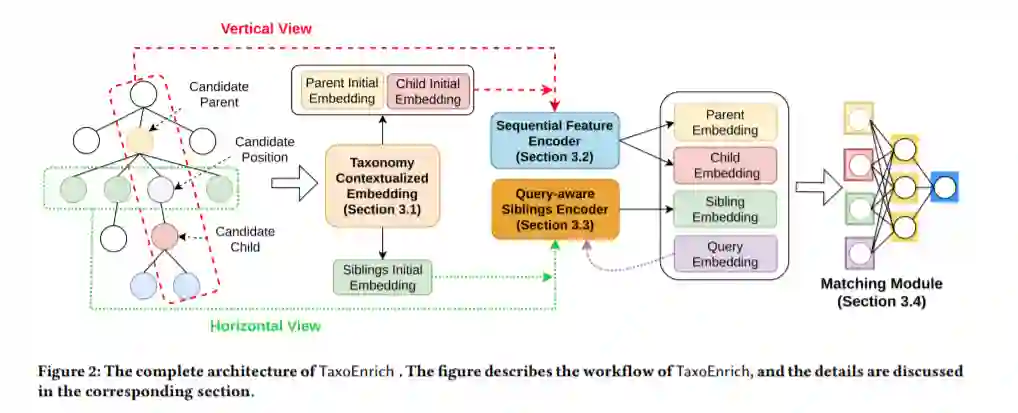 分类法是各种领域中许多真实世界应用的基础,可以作为知识的结构表示。为了处理需要作为分类法组织起来的越来越多的新概念,研究人员转而使用新概念自动补全现有的分类法。本文提出了一种新的分类法补全框架TaxoEnrich,该框架有效地利用了现有分类法中的语义特征和结构信息,并提供了更好的候选位置表示,以提高分类法补全的性能。具体而言,TaxoEnrich由四个部分组成:(1)基于强大的预训练的语言模型,将概念语义和分类关系结合起来的分类上下文嵌入;(2)分类感知序列编码器,通过对分类结构信息进行编码来学习候选位置表示;(3)查询感知兄弟编码器,根据候选兄弟编码对查询位置匹配的重要性,自适应聚合候选兄弟编码以增强候选位置表示;(4)用我们的新候选位置表示扩展了现有工作的查询-位置匹配模型。在来自不同领域的四个大型真实数据集上进行的大量实验表明,TaxoEnrich在所有评价指标中获得了最好的性能,并且大大超过了以前最先进的方法。