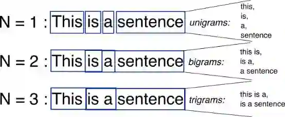 正如我们在图中看到的那样,n-gram是您可以在源文本中找到的长度为n的相邻单词的所有组合(在本例中为n)。
