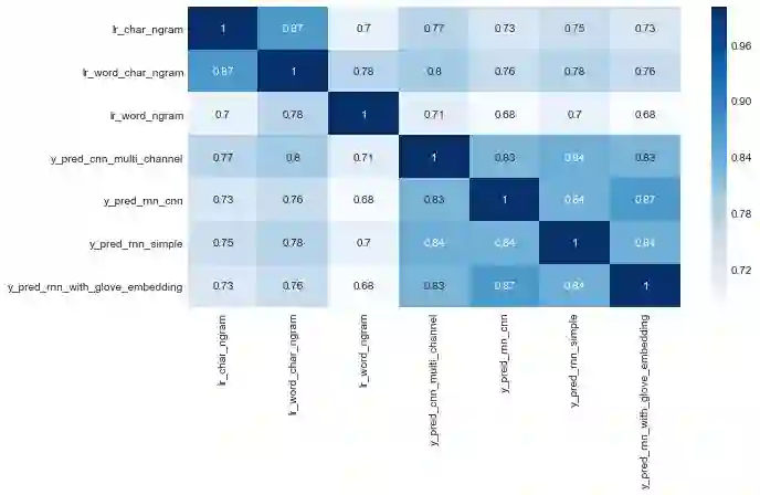 sns.heatmap(predictions.drop('y_true', axis=1).corr(method='kendall'), cmap="Blues",