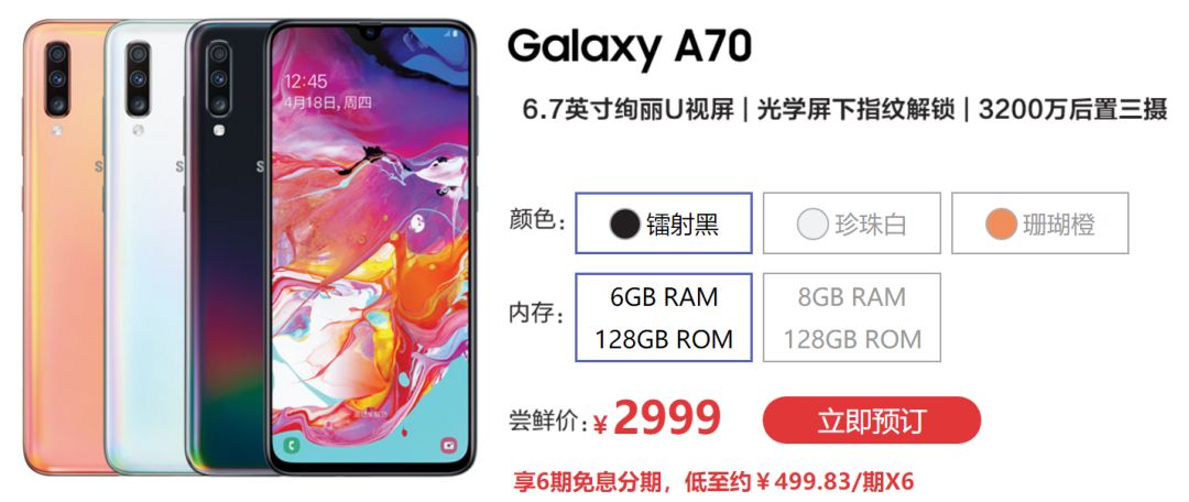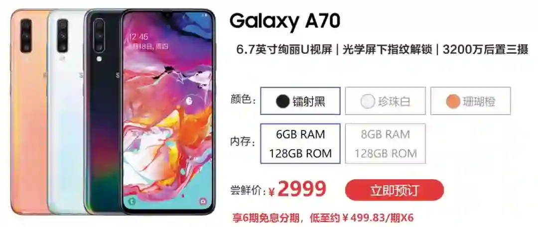 目前,GalaxyA70国行版已经开启了尝鲜价预售,6GB+128GB售2999元,8GB+128GB售3299元。