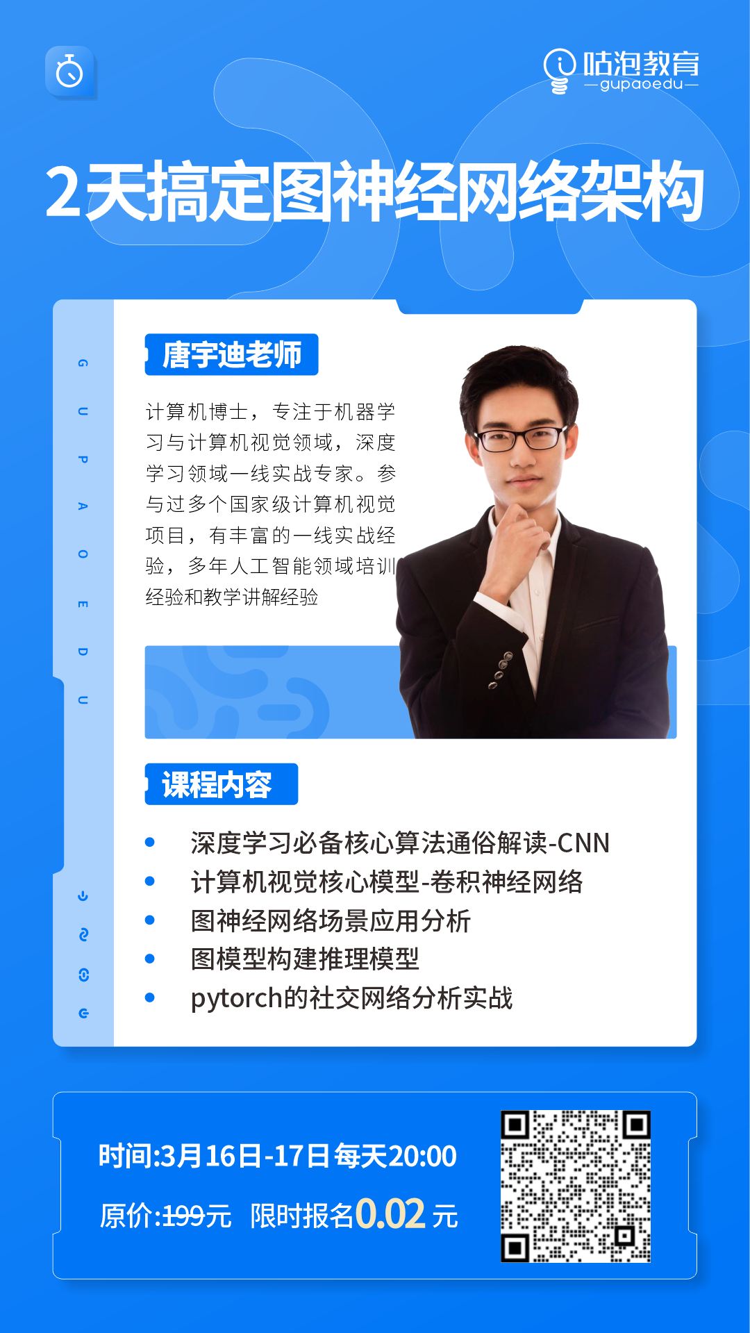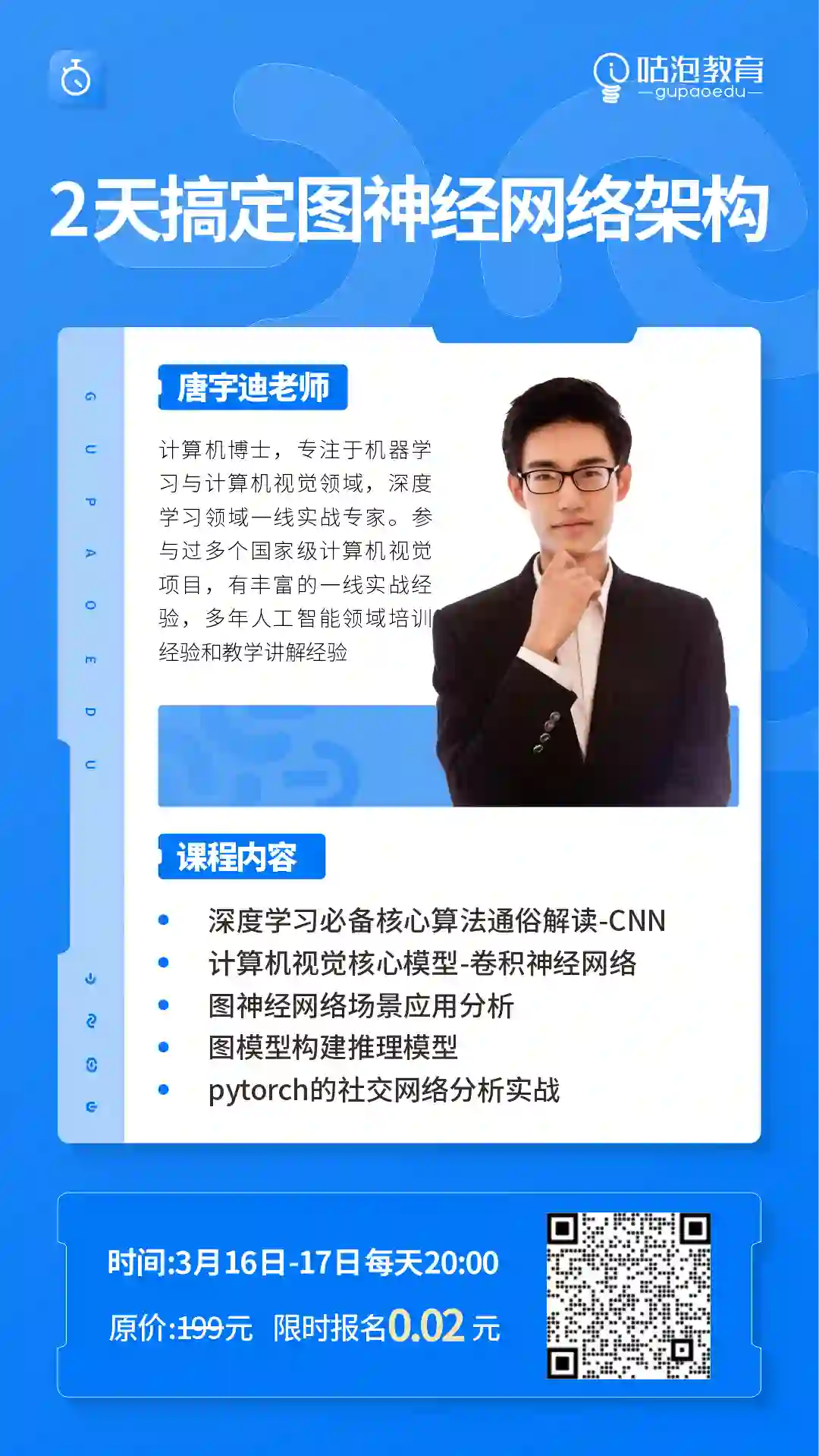 那么为了让大家更好地掌握图神经网络, 「咕泡教育」特别邀请到「人工智能实战专家 - 唐宇迪博士」,专为深度学习的同学开设了「图神经网络架构训练营 - <实战篇>」 ,既包括前沿的学术分享、又有来自头部大咖的实践分享。