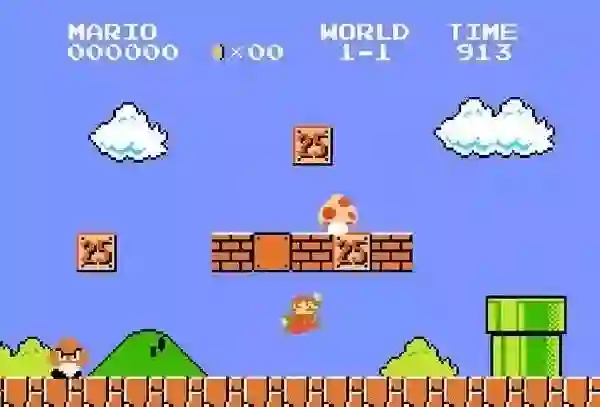游戏一开始,你的化身马里奥出现在近乎空白的屏幕左侧,你随意按几个方向键就会发现,不能往左移动了,只能往右,很快也知道了哪个功能键可以让他跳起来,看见问号箱子,跳起来一顶,就会出现一个神奇的蘑菇……