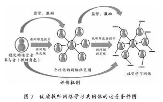 网络学习共同体中每个个体交往行为的交叉性,构成了网络学习共同体的运营模式。基于社交学习网络视角,“互联网+”环境中教师网络学习共同体的运营模式,主要应满足三个条件(1)大数据分析技术下的社交链接条件;(2)交互中的教研过程设计条件;(3)评价和监督条件,如图7所示。