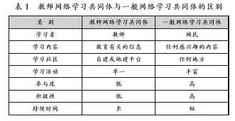 就现有的大多数网络学习共同体而言,我们不难发现,这种自主参与、自主发起的网络学习共同体,主要停留在个体学习和交互式学习,具有社交性、持续性、学习性的特性,能促进参与者的个体学习和交互式学习。我们认为,教师网络学习共同体作为网络学习共同体的专业群体之一,更有其专业性、独特性:网络学习共同体在社交学习网络中有多种多样的存在形式和对象个体,因为对象的不同,社交学习网络中衍生的共同体内部活动形式大相径庭,交互规则也有着不同。具体的,教师网络学习共同体与一般网络学习共同体的差异,如表1所示。