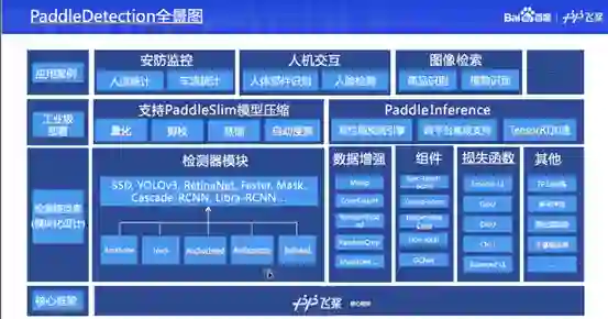 (2)模型丰富,在模型库层面上百度支持了10余种主流算法,100多种目标检测模型,同时持续提升服务器端以及移动端优化改进模型,(3)高性能和工业级部署,PaddleDetection性能高,而且工业级部署上有一套全流程解决方案。