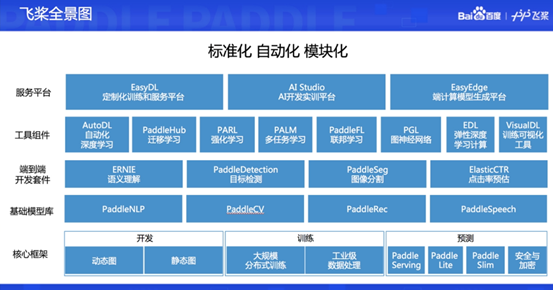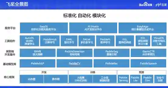 基于飞桨框架,百度开源了自然语言处理、计算机视觉、推荐系统以及语音处理等模型库,在基础模型库之上又开源了一系列端到端开发套件,在端到端开发套件之上开源了一键式迁移学习工具PaddleHub,还有自动进行网络结构设计的AutoDL,另外还开源了定制化训练服务平台EasyDL以及一站式开发训练平台AI Studio。