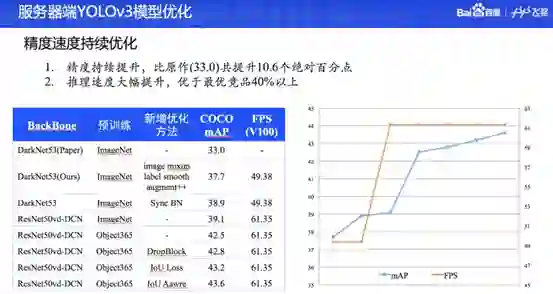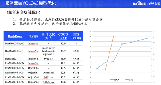 百度更进一步优化精度,比如用了PaddleClas里面开源SSLD知识蒸馏模型作为预训练权重用到了CLoU Loss、可变形卷积和自动图像增强等一系列的优化方式,将精度最终优化了5.2个百分点,推理速度提升了38%,在TeslaV100上预测速度达到60帧/秒。