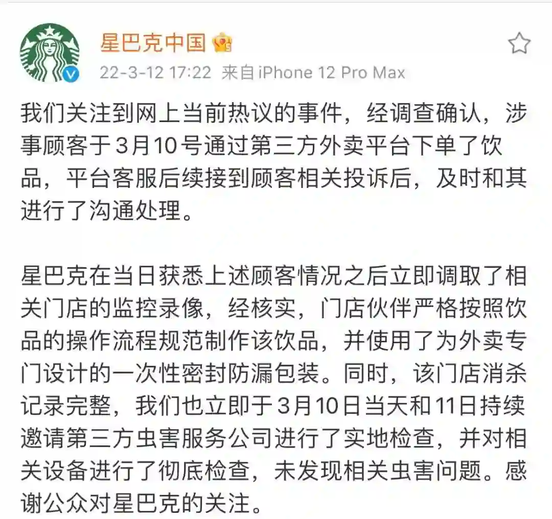 近日,有博主发图称在星巴克饮品中喝出活蟑螂,引起网友热议。星巴克中国微博12日回应称,经调查确认,涉事顾客于3月10号通过第三方外卖平台下单了饮品,获悉上述顾客情况之后立即调取了相关门店的监控录像,经核实,门店严格按照饮品的操作流程规范制作该饮品,并使用了为外卖专门设计的一次性密封防漏包装。门店消杀记录完整,也邀请第三方虫害服务公司进行了实地检查,未发现相关虫害问题。(每日经济新闻)
