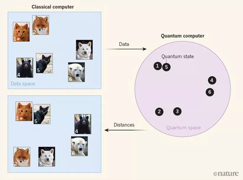 数据空间中许多关于“相似性”的定义,在数学上相当于在可能无限大的空间中的相似性的简单量度。因此,在每次比较两个图像时,图像可以被映射到巨大空间中的表示,并计算映射和原图像之间的简单相似性。目前,传统计算机无法确切地计算这个大型表示,但也许量子计算机可以。因为量子计算机能够在极大的空间中进行计算。如果将数据映射到量子态所在的空间,会发生什么呢?