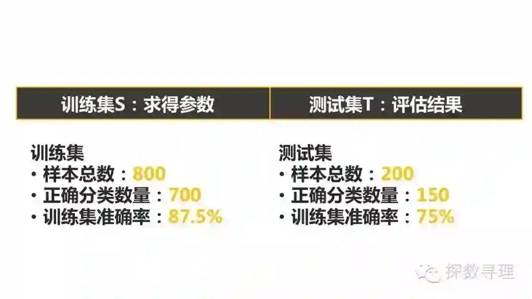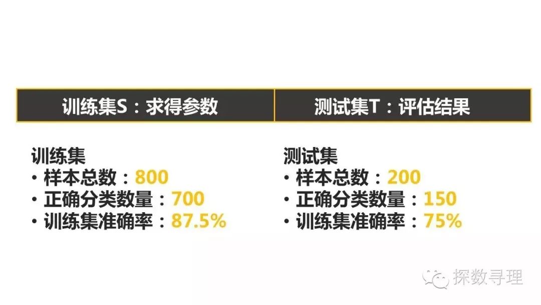 划分出集合后,我们就可以在训练集S上进行模型训练,再在测试集T上评估结果。假如在训练集中,我们有700个样本被正确分类,那么分类的正确率就有700/800*100%=87.5%,而在测试集中,假如我们只有150个样本被正确分类,那么分类的正确率绩优150/200*100%=75%.