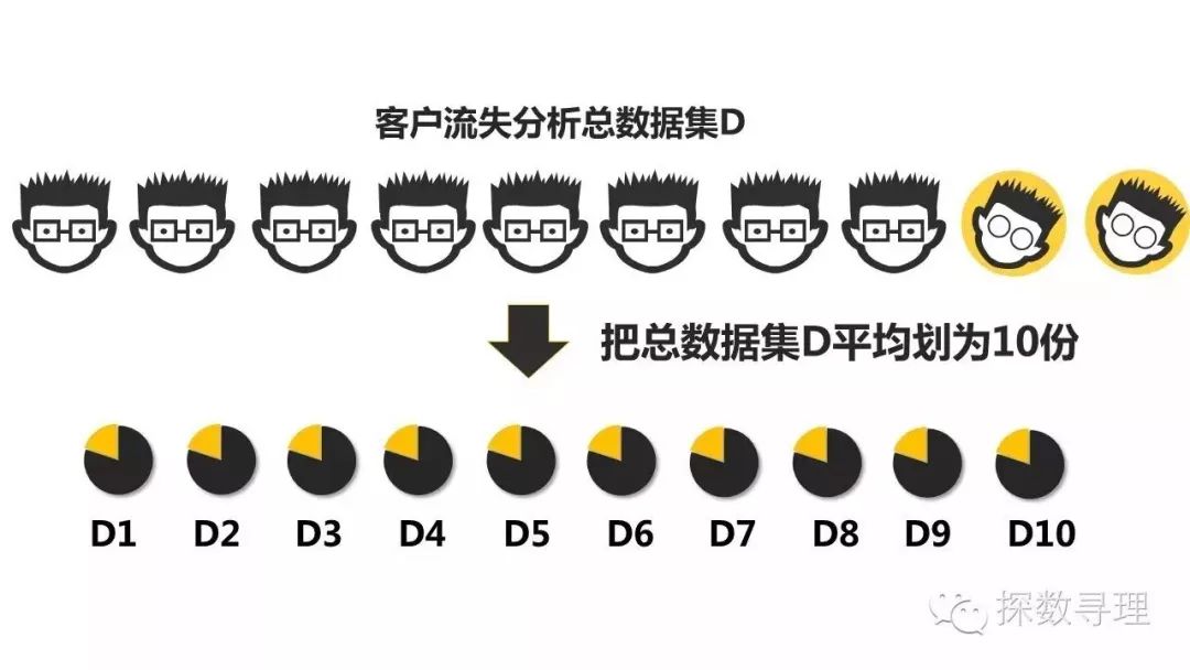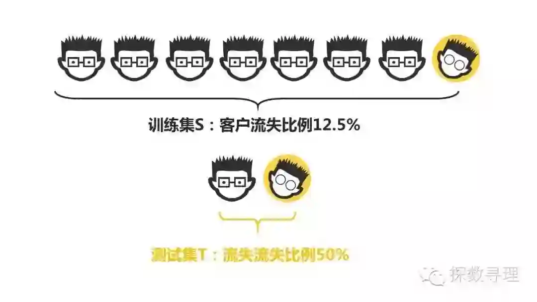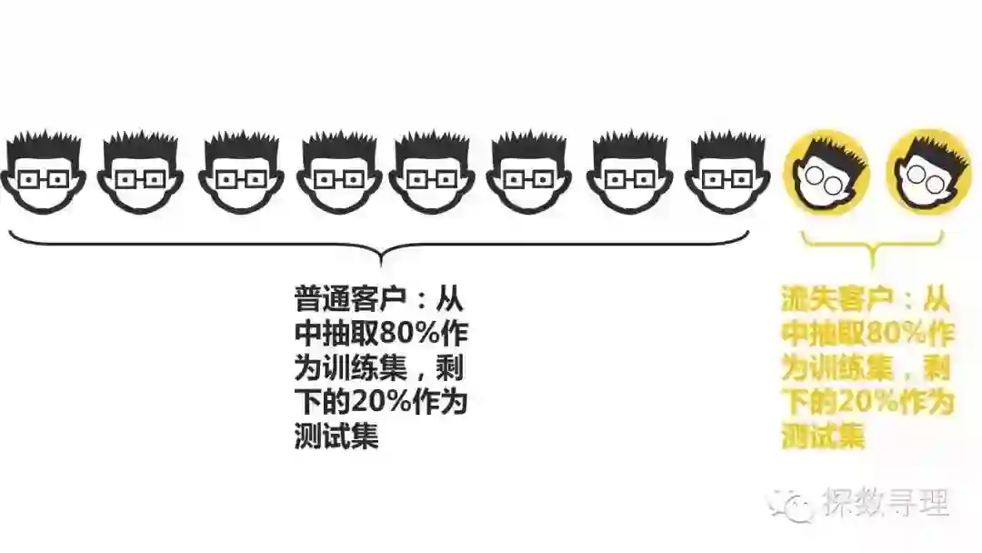 回到原来的例子,我们可能从200个流失客户中随机抽取80%放到训练集,20%放到测试集;再从800个非流失客户中抽取80%放到训练集,剩下20%又放回到测试集。值得注意的是,划分训练集以及测试集的方法是多样的,我们完全可以通过抽样方法的结合,帮助我们更好的决定训练集以及测试集的组成;