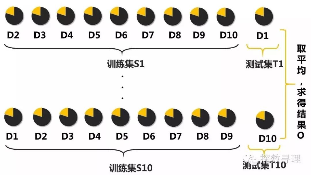 以上过程,我们称之为10折交叉检验。一般而言,在平常的使用中,10折交叉检验比较常见,当然也会有5折交叉检验,3折交叉检验。